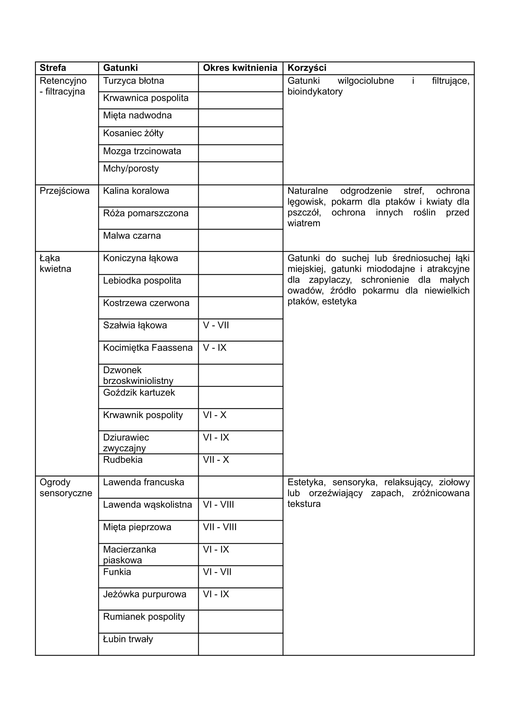Redukcję zanieczyszczeń: W strefie przy alei Grunwaldzkiej planuje się wykorzystanie gatunków chłonących zanieczyszczenia, takich jak mchy i porosty.