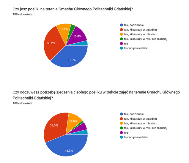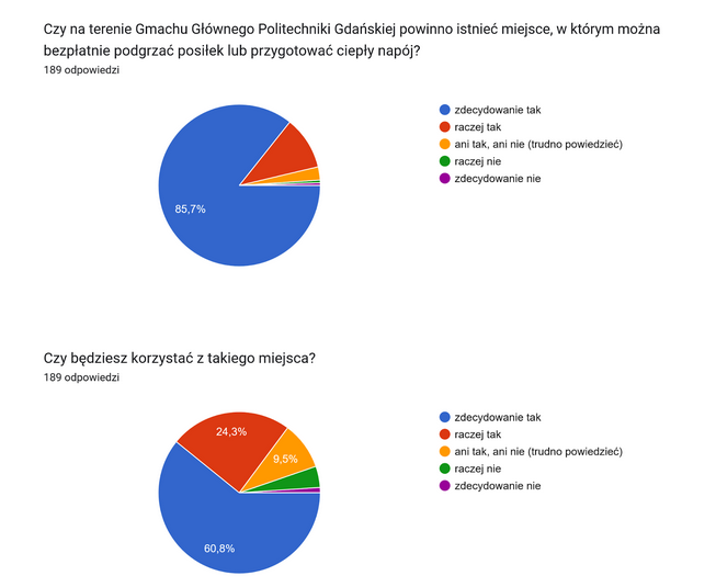 Projekt wynika z codziennych doświadczeń studentów i studentek PG. Został także potwierdzony badaniami przeprowadzonymi przez samych studentów w okresie od 5 do 13 listopada 2025 roku. Badania w formie sondażu prowadzone były wśród studentów przebywających na terenie Gmachu Głównego PG oraz uzupełnione ankietą online (z użyciem tego samego narzędzia badawczego). W badaniu wzięło udział 189 studentów i studentek PG. Pełny wynik badań przesłany w załączeniu do wniosku ( https://docs.google.com/document/d/1JrVHQN50WGZCDRrktAq3QGBtmZvS_y2QOpOzKq9SG2U/edit?usp=sharing). Wyniki badania pokazują, że potrzebę spożycia ciepłego posiłku codziennie lub kilka razy w tygodniu deklaruje 77% badanych osób. Ze stwierdzeniem, że na terenie GG PG powinno istnieć miejsce, w którym można bezpłatnie podgrzać posiłek lub przygotować ciepły napój zdecydowanie zgadza się 86%, a raczej zgadza się 11% ankietowanych osób studiujących na PG. Chęć korzystania z takiego miejsca deklarowało 85% respondentów (w tym 61% odpowiedziało zdecydowanie tak, a 24% raczej tak).