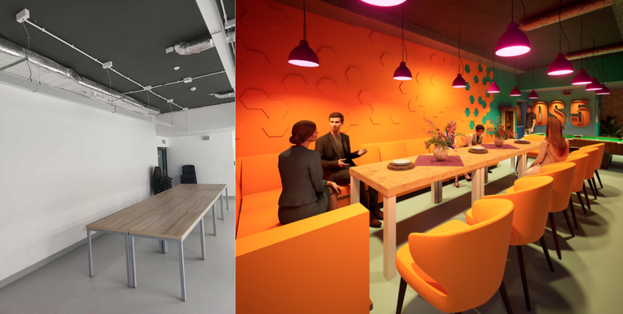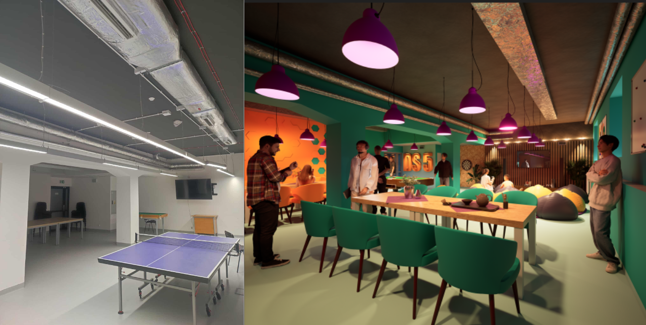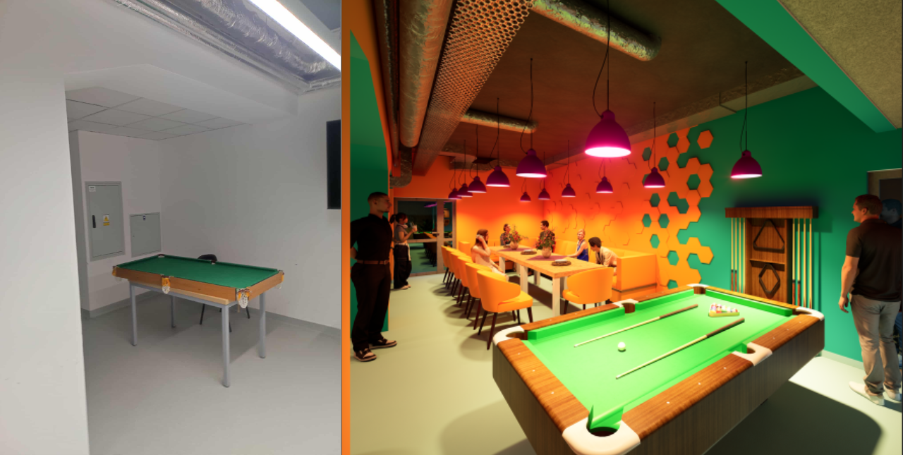 Nowe wyposażenie pozwoli zwiększyć wygodę użytkowników przestrzeni (zgodnie z celem "Utworzenie stref relaksu zewnętrznych i wewnętrznych"). Stare krzesła zostaną zastąpione nowymi wygodniejszymi modelami. Dodatkowo pufy oraz kanapy pozwolą użytkownikom na poczucie, jakoby znajdowali się w prawdziwej sali telewizyjnej, w której będą mogli znaleźć oddech po całym dniu nauki, oglądając seans i pogłębiając relacje z innymi osobami. Montaż na ścianie dodatkowych paneli dźwiękochłonnych pozwoli ograniczyć wpływ powstającego w przestrzeni dźwięku na innych mieszkańców akademika, z kolei odmalowanie ścian skutkować będzie poprawą samopoczucia, ze względu na niedobór w pobliżu jasnych, ciepłych barw.