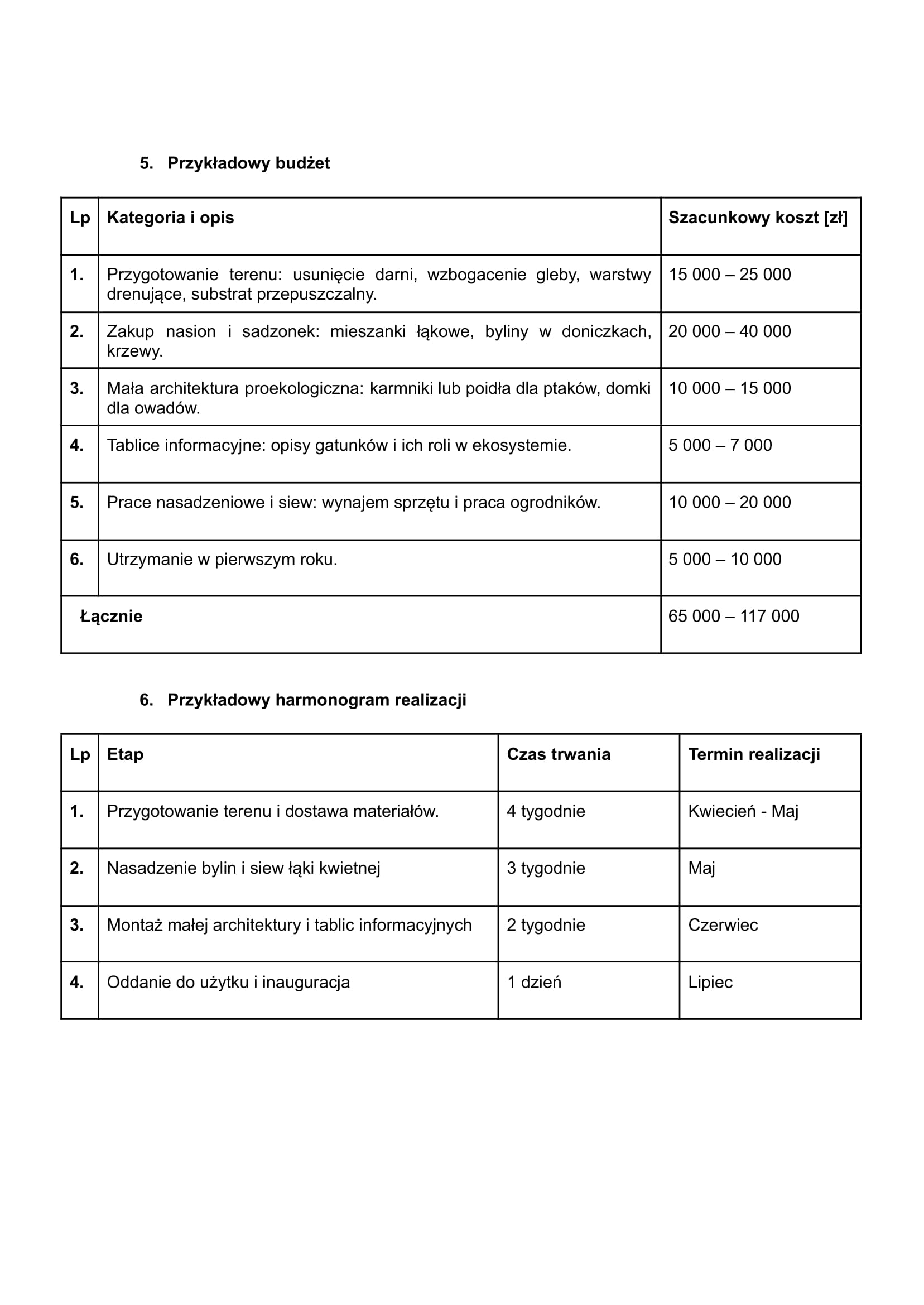 Wsparcie dla lokalnej fauny: Projekt stawia duży nacisk na zasilenie terenu roślinami sprzyjającymi lokalnym owadom zapylającym i ptakom , m.in. przez tworzenie łąki kwietnej i montaż domków dla zapylaczy oraz karmników/poideł.